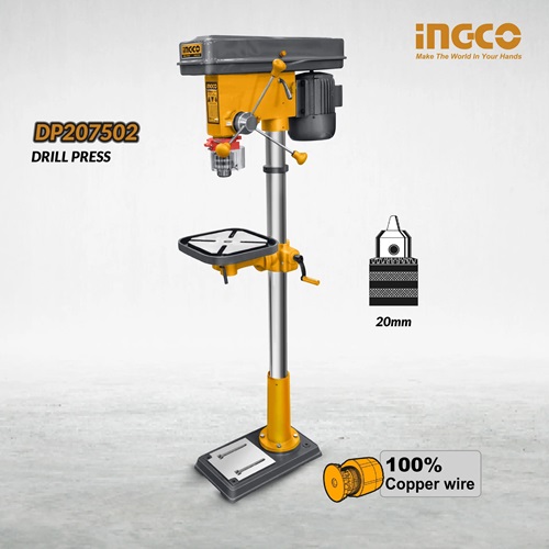 The INGCO DP207505 Drill Press offers precision drilling with adjustable speed settings and a sturdy base for stable performance. Ideal for woodworking, metalworking, and DIY projects, it ensures clean, accurate holes every time. Its powerful motor and versatile design make it perfect for both professionals and hobbyists alike.