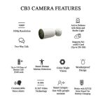 What’s in the box: CB3 Camera, Screw Base, USB Cable, Mounting Plate, Drill Template, Screw Kit, Regulatory Information, Quick Start Guide