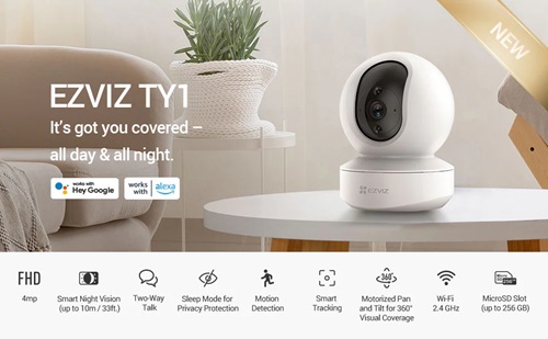 Smart Wi-Fi Pan & Tilt Camera Watch over your entire space easily with the TY1 Camera?s 360-degree field-of-view and its smart tracking feature. It?s got you covered ? all day & all night. Description: 960p/1080p, Motorized Pan and Tilt for 360? Visual Coverage, Motion Detection, Two-Way Talk, Wi-Fi 2.4 GHz, Smart Night Vision (up to 10m / 33ft.), Sleep Mode for Privacy Protection, Smart Tracking, View from Anywhere, MicroSD Slot (up to 256 GB) What's in the box: TY1 Pan/Tilt Camera; Base; Screw Kit; Power Cable 3m (9.8 ft.); Drill Template ; Power Adapter ; Quick Start Guide