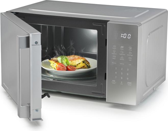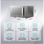 Key Features 1000W Power Output: Ensures quick and efficient cooking, reducing preparation time for meals. 10 Power Levels: Offers versatility to adjust cooking intensity according to different food types and recipes. 6 Auto Cooking Menus: Pre-programmed settings for common items like potato, beverage, popcorn, frozen vegetables, pizza, and dinner plate, simplifying cooking. Mirror Glass Door: Provides a sleek and modern appearance, enhancing the aesthetic of your kitchen. Defrost Function: Allows for quick and even thawing of frozen foods, preserving texture and flavor. Digital Control Panel: Features a user-friendly keypad for precise control over settings. Push Button Door: Ensures easy and safe access to the microwave cavity. Child Safety Lock: Prevents accidental operation, ensuring safety in households with children. End Cooking Signal: Alerts you when the cooking cycle is complete. White Cavity: Facilitates easy cleaning and maintenance. Digital Clock and Timer: Keeps track of cooking time and current time. Specifications Capacity: 36 Liters Microwave Power: 1000W Dimensions: 519mm (W) ? 426mm (D) ? 315mm (H) Turntable Size: 315mm Voltage: 230?240V, 50Hz Weight: 16 kg Color: Silver with Mirror Glass Door